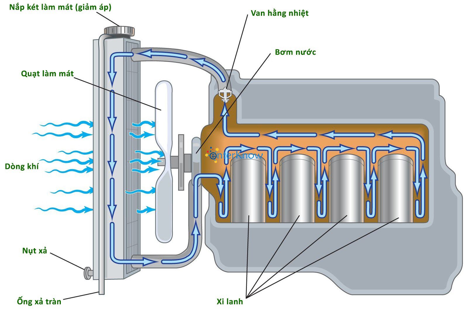 Khi nhiệt độ của động cơ đạt đến nhiệt độ mong muốn (thường là khoảng 200 oF, 95 oC), van hằng nhiệt sẽ mở ra, cho phép dòng chất làm mát chảy đến bộ tản nhiệt và ngăn động cơ quá nóng.