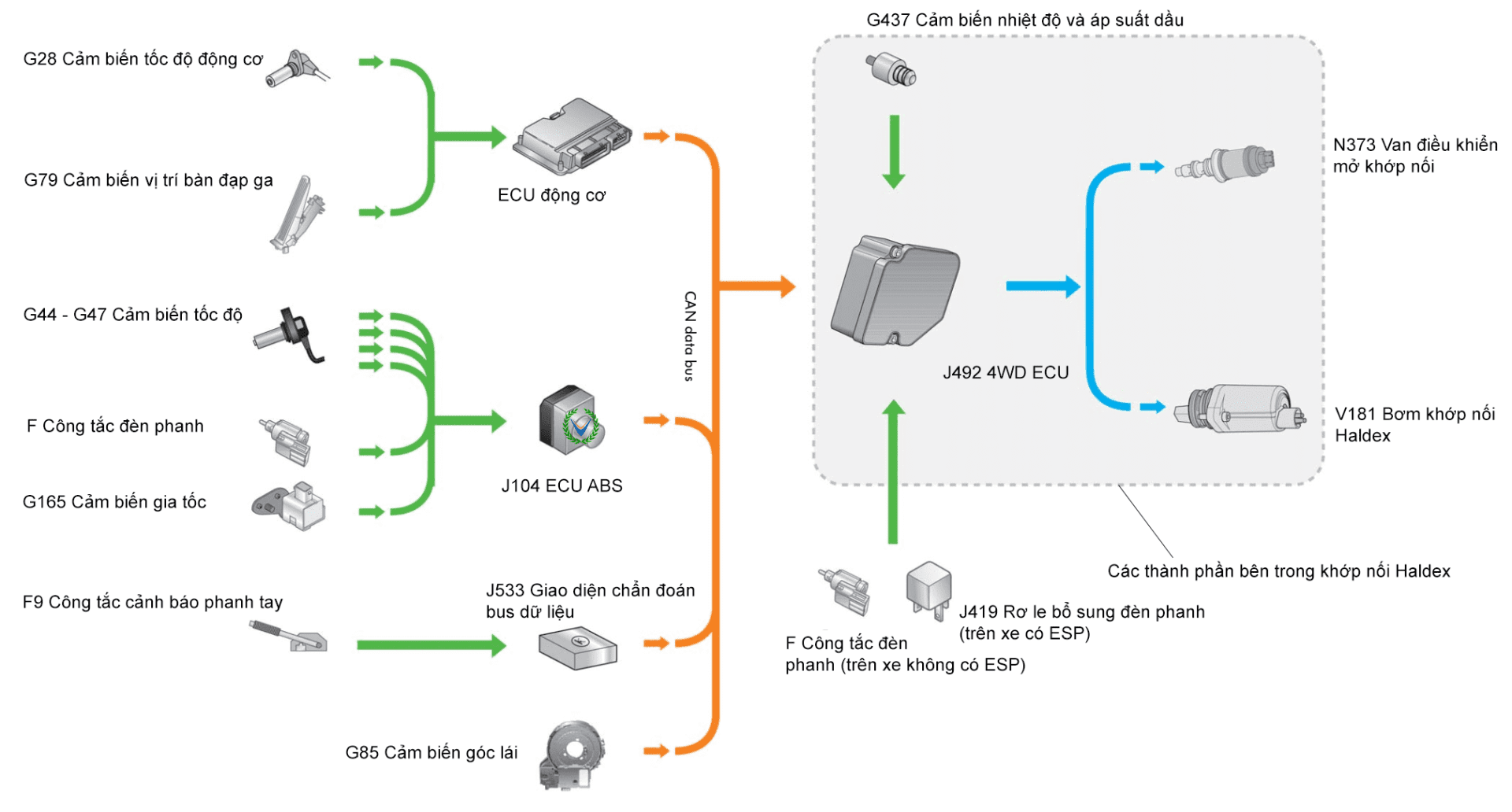 Các thành phần điện và điện tử bao gồm cảm biến áp suất dầu và nhiệt độ dầu G437 cộng với máy bơm khớp nối Haldex V181 và van điều khiển độ mở khớp nối N373 làm phần tử điều khiển. Hơn nữa khớp nối Haldex có bộ phận điều khiển riêng, bộ điều khiển dẫn động bốn bánh J492.