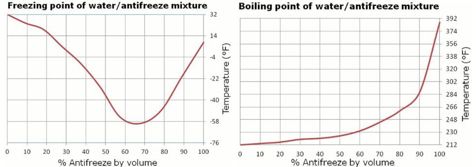 Sự thật phải lưu ý rằng chỉ riêng chất chống đông đơn thuần sẽ không thực hiện nhiệm vụ bảo vệ hệ thống làm mát của xe của bạn tốt hơn nhiều so với bản thân nước. Trên thực tế, chất chống đông nguyên chất sẽ đóng băng ở nhiệt độ không thấp hơn nhiều so với nhiệt độ của nước. Ở những vùng khí hậu lạnh nhất, hỗn hợp hiệu quả nhất để chống lại sự đông cứng sẽ bao gồm 60-70% chất chống đông (với phần còn lại là nước) – không phải 100%.