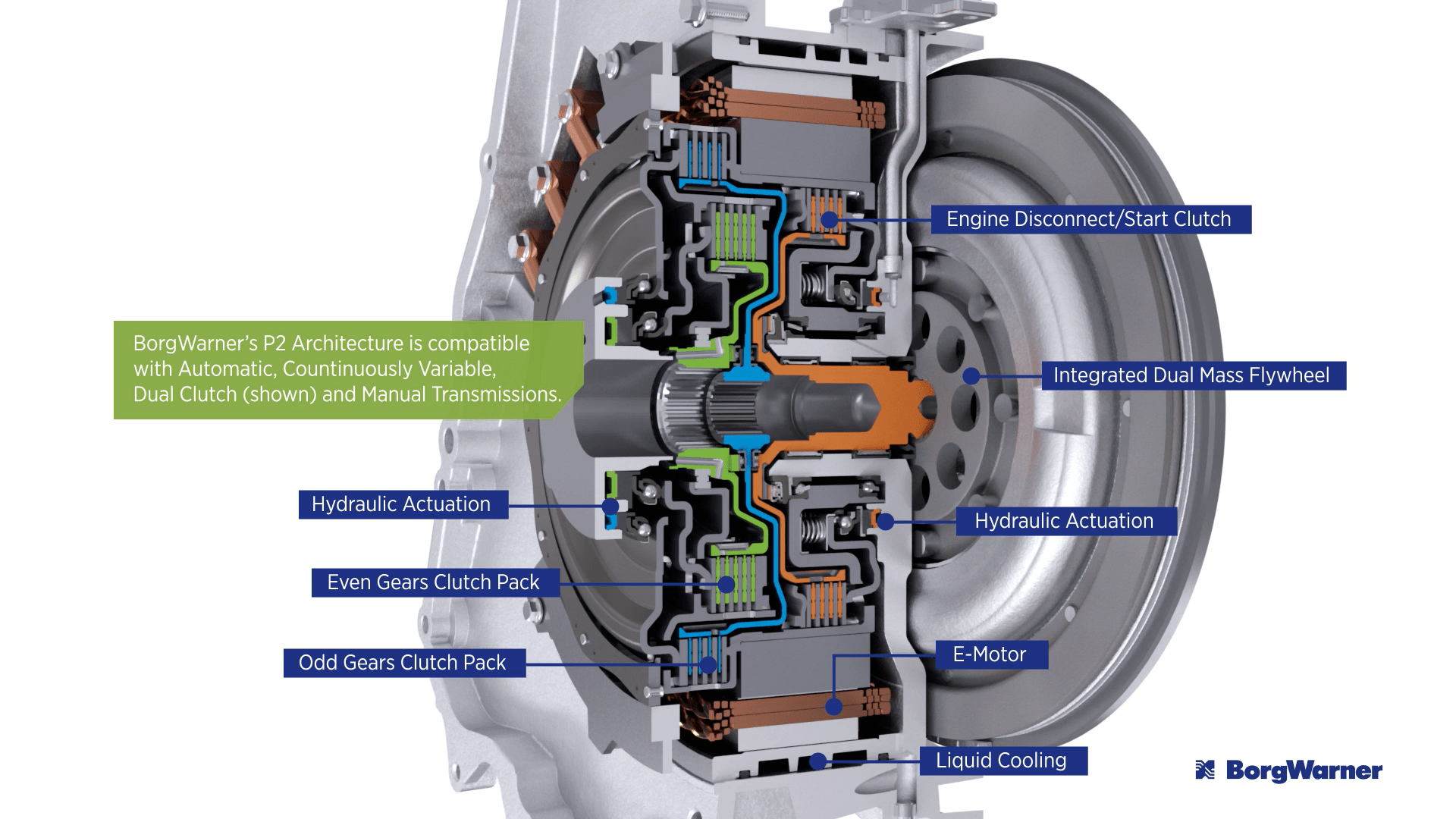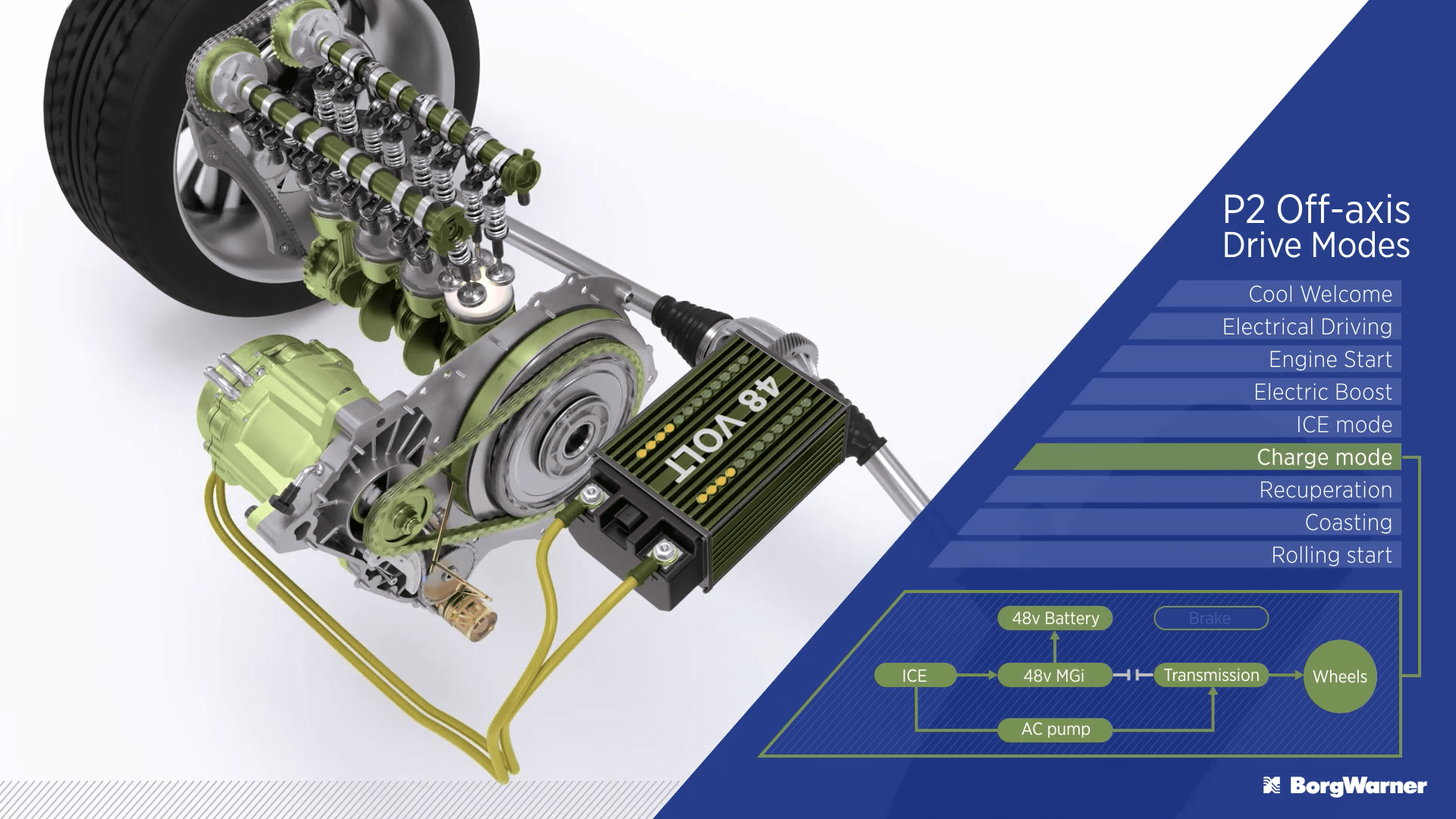 Mô-đun P2 của BorgWarner chuyển đổi một chiếc xe chạy bằng động cơ đốt trong thành hybrid mà không cần thay đổi động cơ hoặc hộp số. Điều đó có nghĩa là các nhà sản xuất ô tô có thể dễ dàng mở rộng danh mục đầu tư xe với ít đầu tư hơn và linh hoạt hơn. Được đặt giữa động cơ và hộp số, mô-đun P2 hiệu quả cao kết hợp động cơ kéo điện 48V, ly hợp ngắt động cơ, thiết bị khởi động và bánh đà khối lượng kép thành một gói nhỏ gọn lồng vào bên trong động cơ điện.