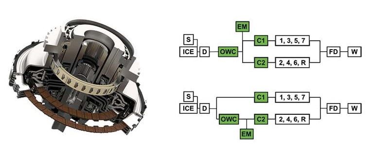 Sử dụng ly hợp một chiều (OWC) thay vì ly hợp ngắt ướt sẽ giúp giảm hơn nữa không gian lắp đặt cũng như độ phức tạp và chi phí của hệ thống, đồng thời tăng hiệu suất. Tuy nhiên, khi sử dụng cùng với hộp số tự động hoặc hộp số biến thiên liên tục, tác dụng phanh của động cơ sẽ bị mất. Có thể dễ dàng giải quyết vấn đề này bằng cách sử dụng hộp số ly hợp kép (DCT), với một OWC và động cơ điện được định vị chỉ kết nối với một bộ truyền một phần.
