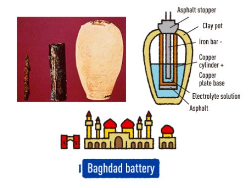“Baghdad Battery” – được gọi là “pin nồi gốm” lâu đời nhất thế giới được phát hiện trong tàn tích của Khu jut Rabu, một ngôi làng ở ngoại ô thủ đô Baghdad của Iraq. Loại pin này có tuổi đời hơn 2.000 năm. Người ta cho rằng nó được sử dụng để mạ kim loại, thay vì dùng làm pin để tạo ra điện.