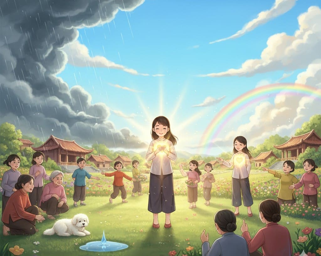 Nhưng rồi, sau mỗi cơn mưa, bầu trời lại quang đãng. Nụ cười của Minh lại nở rộ, xua tan mây đen, mang theo tia nắng ấm áp trở lại. Mọi người lại vui vẻ hái hoa, hát ca dưới bầu trời xanh biếc.