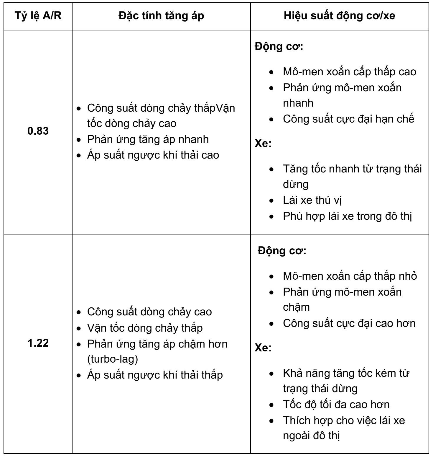 - Tỷ lệ A/R lớn sẽ cải thiện công suất dòng chảy của bộ tăng áp ở tốc độ động cơ cao, giảm áp suất ngược trong ống xả. Điều này sẽ nâng cao khả năng “thở” (trao đổi khí) của động cơ ở tốc độ cao và đẩy công suất cực đại về giá trị cao hơn. Hạn chế là ở tốc độ động cơ thấp và trung bình, tốc độ khí thải sẽ thấp hơn (do diện tích dòng khí lớn hơn) và việc tăng lượng khí nạp sẽ chậm hơn (turbo-lag).