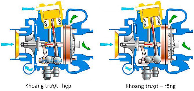 Ở tốc độ động cơ thấp, vòng vòng jiclơ hay khoang trượt bị đẩy sang phải, làm giảm diện tích mặt cắt ngang và tỷ số A/R. Điều này sẽ buộc tốc độ khí thải tăng lên, bộ tăng áp sẽ quay nhanh hơn và lượng khí nạp tăng lên.