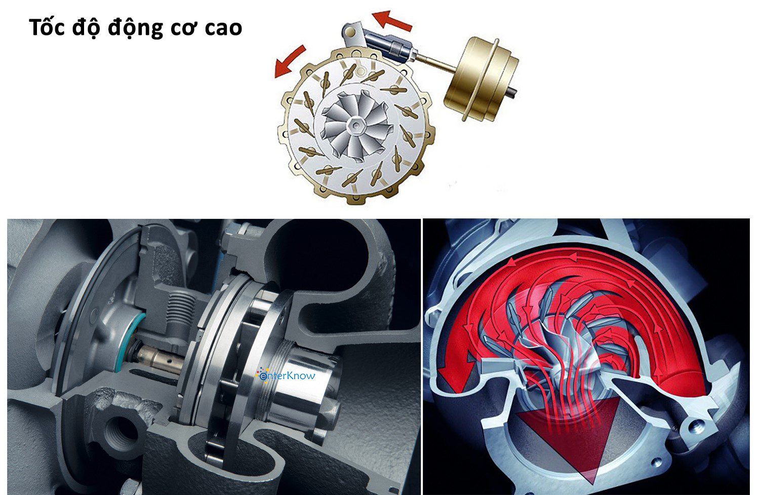Ở tốc độ động cơ cao, các cánh gạt ở vị trí rộng, diện tích mặt cắt ngang cho dòng khí thải lớn, tỷ lệ A/R đạt giá trị cực đại và vận tốc của khí thải qua tuabin ở mức tối thiểu. Tốc độ máy nén sẽ chậm hơn nhưng đủ để cung cấp lượng khí nạp cần thiết.