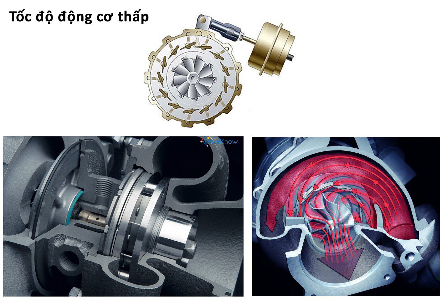 Ở tốc độ động cơ thấp, các cánh ở vị trí hẹp, diện tích mặt cắt ngang của dòng khí thải nhỏ, tỷ số A/R ở giá trị tối thiểu và vận tốc của khí thải qua tuabin ở mức tối đa. Điều này chuyển thành tốc độ máy nén cao và lượng khí nạp tăng áp cao.