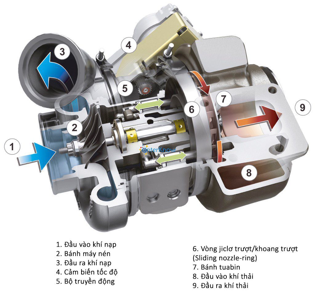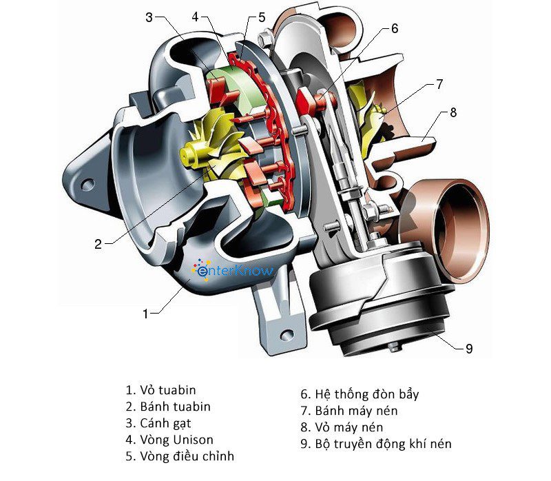 EnterKnow: Tăng áp là công nghệ được sử dụng phổ biến nhất trong động cơ đốt trong để tạo ra cảm ứng khí nạp cưỡng bức. Các bộ phận chính của turbo tăng áp là tua bin và máy nén. Vai trò của tuabin là sử dụng năng lượng nhiệt và động năng (bộ tăng áp cuộn đôi) của khí thải và chuyển nó thành năng lượng cơ học. Vai trò của máy nén là sử dụng năng lượng cơ học và nén khí nạp để tăng mật độ của nó.
